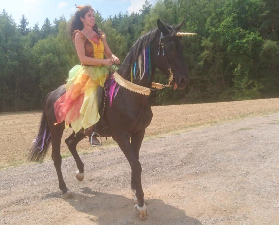 „Und wenn Ihr das Einhorn und die Waldfee gefunden habt, fasst sie nicht an. Ladet sie ein, zu uns auf den Reitplatz zu kommen. Einhörner und Waldfeen sind sehr scheu. Sie merken aber sofort, wer gut und freundlich ist. Nur mit guten Kindern kommen sie mit.“