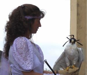 Die „Dame“ auf der Landpartie von Schloss Hexenagger / Altmühltal mit dem weißen Gerfalken „Sheila“ aus der Falknerei von Martin Müller .