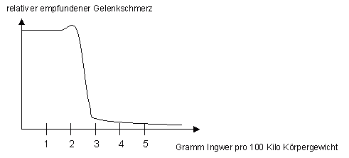 Für getrockneten Ingwer mit etwa 2,5% Scharfstoffgehalt und für afrikanischen Ingwer mit niedrigerem Scharfstoffgehalt (ungefähr 1,5 %) wurden von anderen und auch mir im Selbstversuch notwendige Mengen zwischen 15 und 30 Gramm pro 100 Kilo Körpergewicht und Tag bei reinen Gelenkerkrankungen des Menschen ermittelt. Auch hier war ein sehr plötzliches Einsetzen der Wirkung erst ab dem Überschreiten einer Schwellenmenge zu beobachten. Das bedeutet, dass ein Mensch also etwa sieben Mal weniger empfindlich auf die schmerz- und entzündungshemmende Wirkung des Ingwers reagiert, als ein Pferd!
