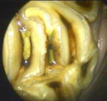 Die Fraktur längs der offenen Pulpen lässt Zersetzung von innen erkennen, in den Pulpen haben sich zudem vergärende Futterreste festgesetzt.